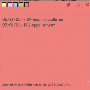 - To document, enter details of the NS or Late cancel in a red sticky note as above. Note any info that might be important for future reference.