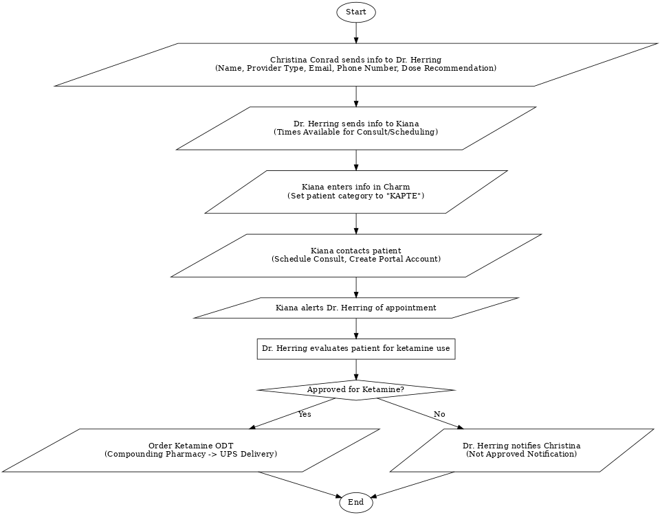 If the participant is approved for ketamine, Dr. Herring notifies Kiana via Charm with recommended dosing.