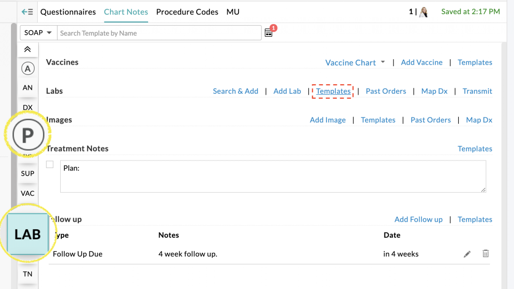 - In your SOAP note navigate to your Plan section and click the “Templates” link