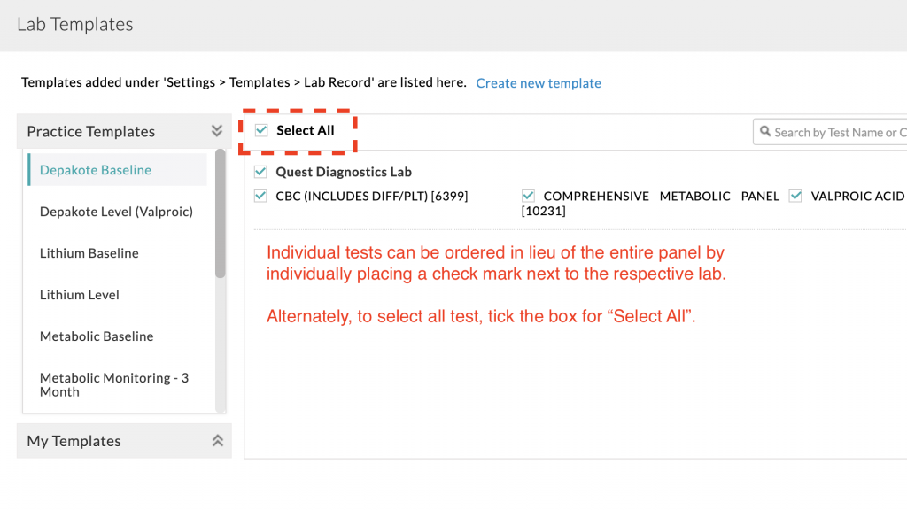 - From the “Practice Templates” menu, scroll to select the lab or lab(s) you want to order.