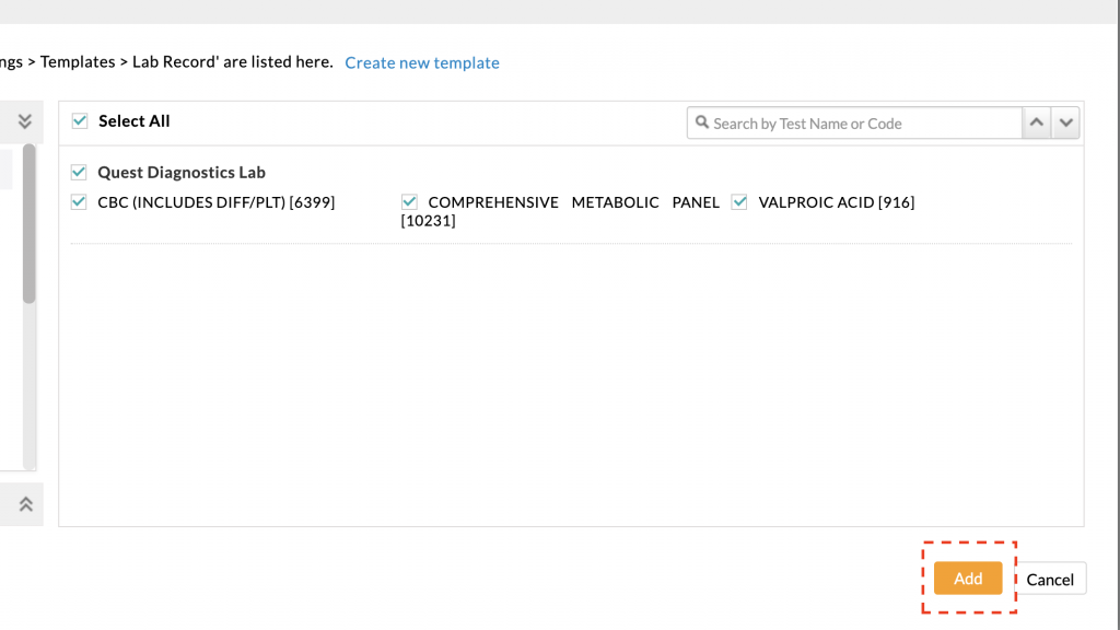 - When you have selected all desired labs, click the Add button to close the Lab Templates window.