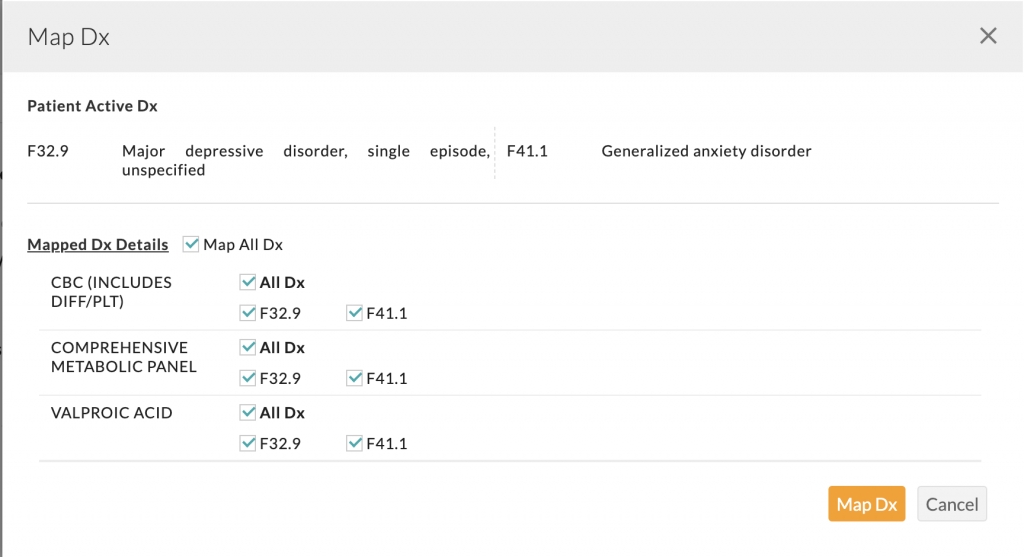 When the Map Dx window opens, you can assign all Active Dx to the orders or modify them as you see fit via ticking the box(s) as required.