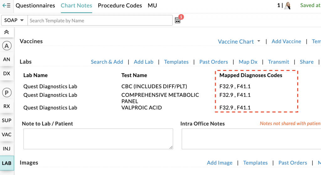 - You will notice that the selected Dx codes are now mapped to your lab orders.