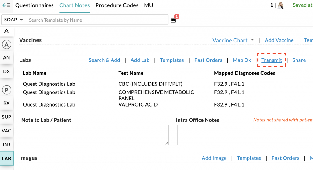 - Transmit the order(s) by clicking the “Transmit” link which opens the Lab Orders List window.
