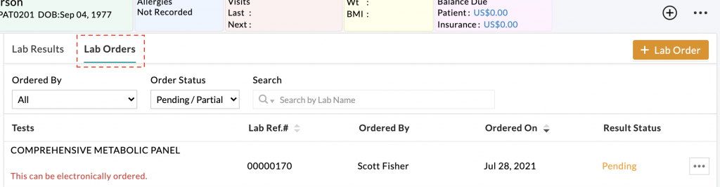 Select the “Lab Orders” tab and then click + Lab Order to add a lab order.