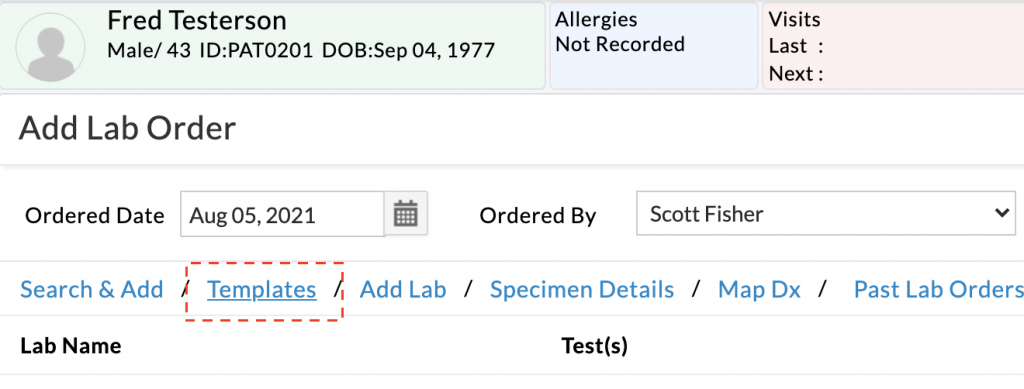 - Click the “Templates” link to open the “Add Lab Order Window”.