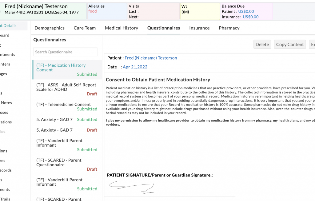 Just as with all other submitted questionnaires, the medication history consent questionnaire will be visible from the patient details section under the questionnaires column.