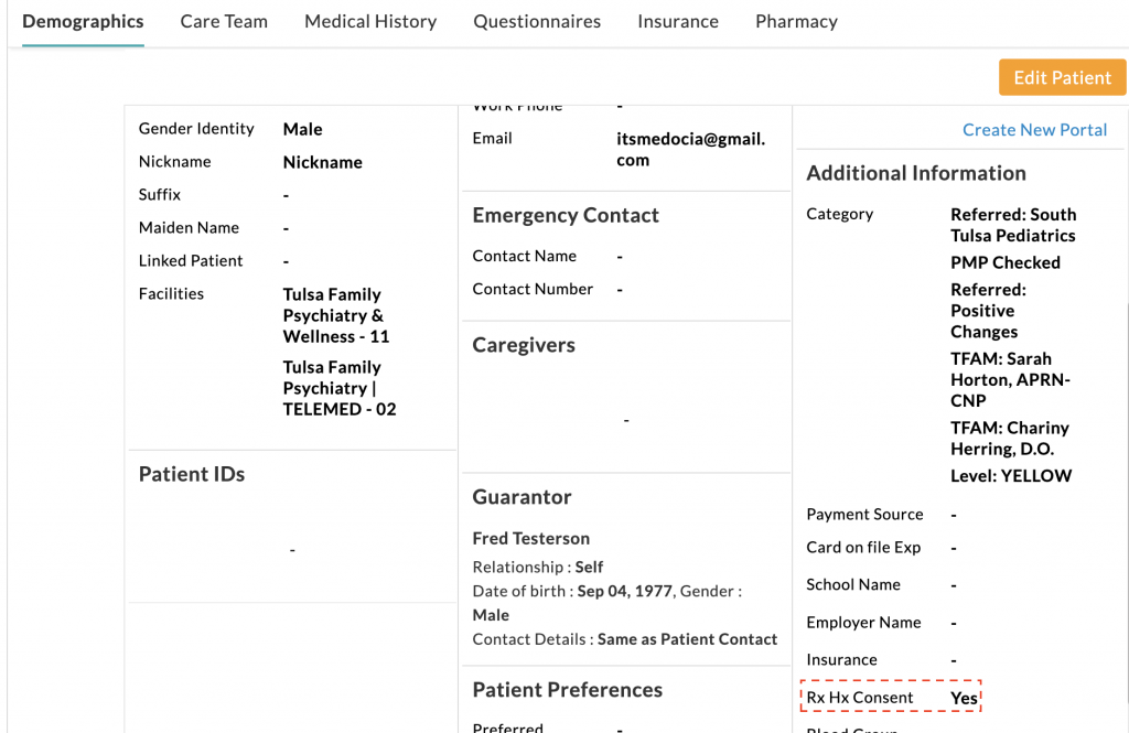 When a patient gives consent for our practice to review their medication history, this should be noted under Patient Details > Demographics > Additional Information as illustrated below in Fred Testerson’s chart under the field “Rx Hx Consent”.